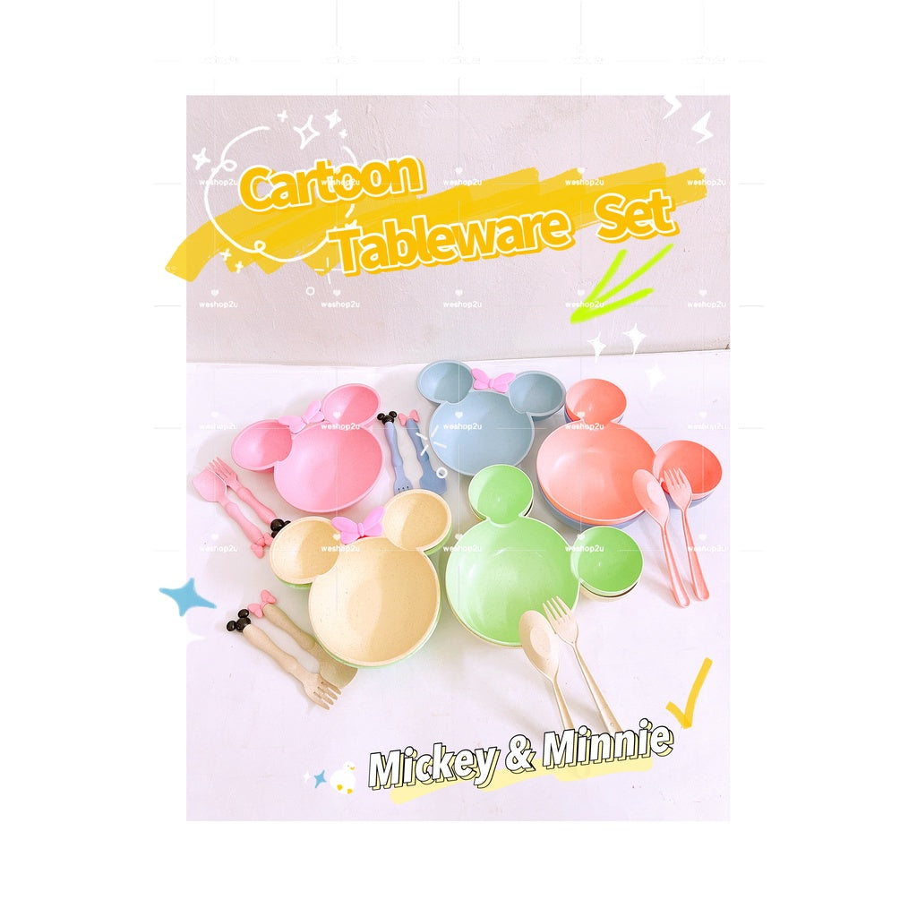 READY STOCK!!!3pcs Set Tableware Mickey/Minnie Kid Children Dish Plate Set Mickey Feeding Spoon Fork Plate Training Bowl