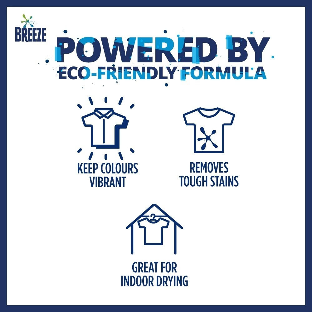 Detailed Product Description:Breeze Goodbye Musty removes stains and eliminates musty smells in just one step. With its advanced 'Deo-Doff' fragrance technology, your laundry will smell fresh and fragrant. This concentrated liquid detergent offers 5 benefits in 1: it cleans deeply, leaves no residue, keeps colors bright, and is gentle on your hands. Choose from three available formulas: Fragrance of Comfort for long-lasting perfume, Color Care for vibrant colored clothes, and Power Clean for tough stain removal and dazzling white clothes. Each 3.6kg bottle is sufficient for up to 123 washes. Experience the power of Breeze Goodbye Musty for clean and fresh laundry.