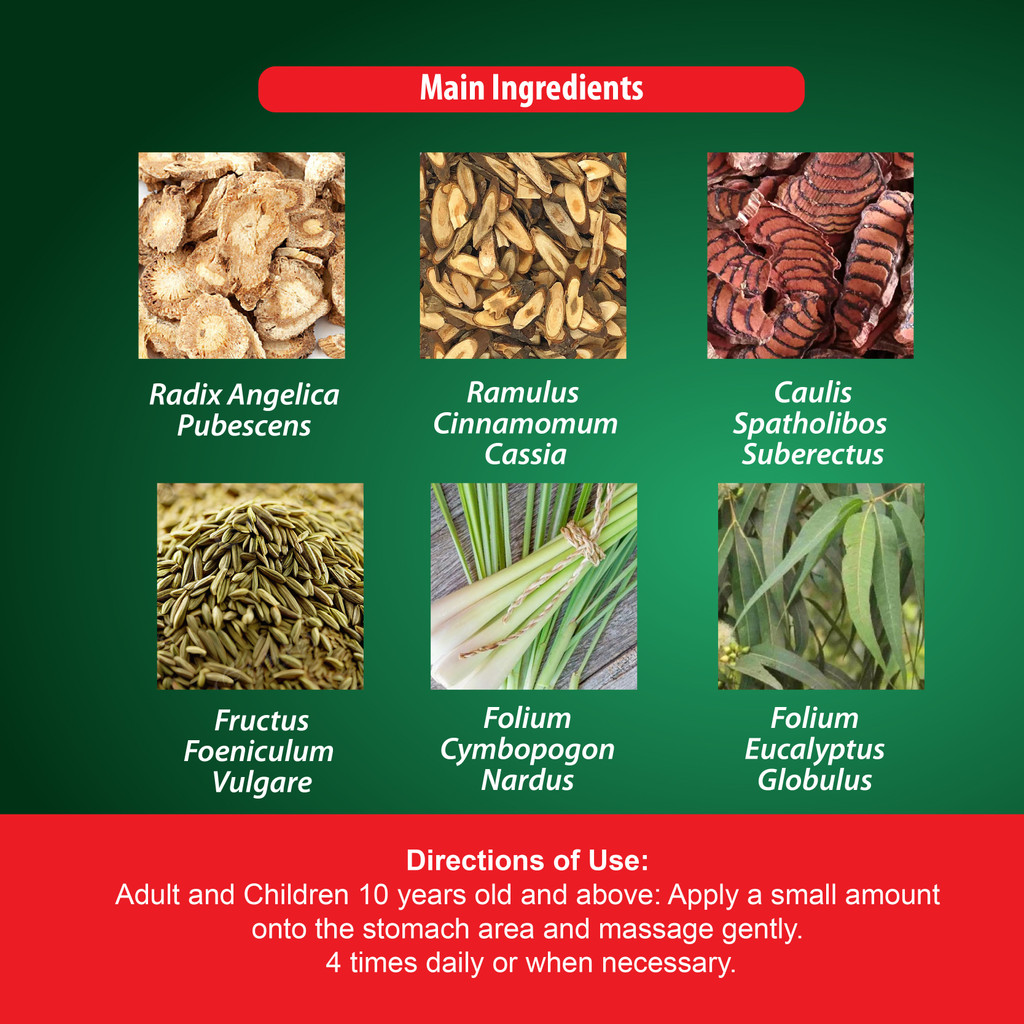 • Adult & Children 10 years old and above: Apply a small amount onto the stomach area & massage gently. 4 times daily or when necessary.