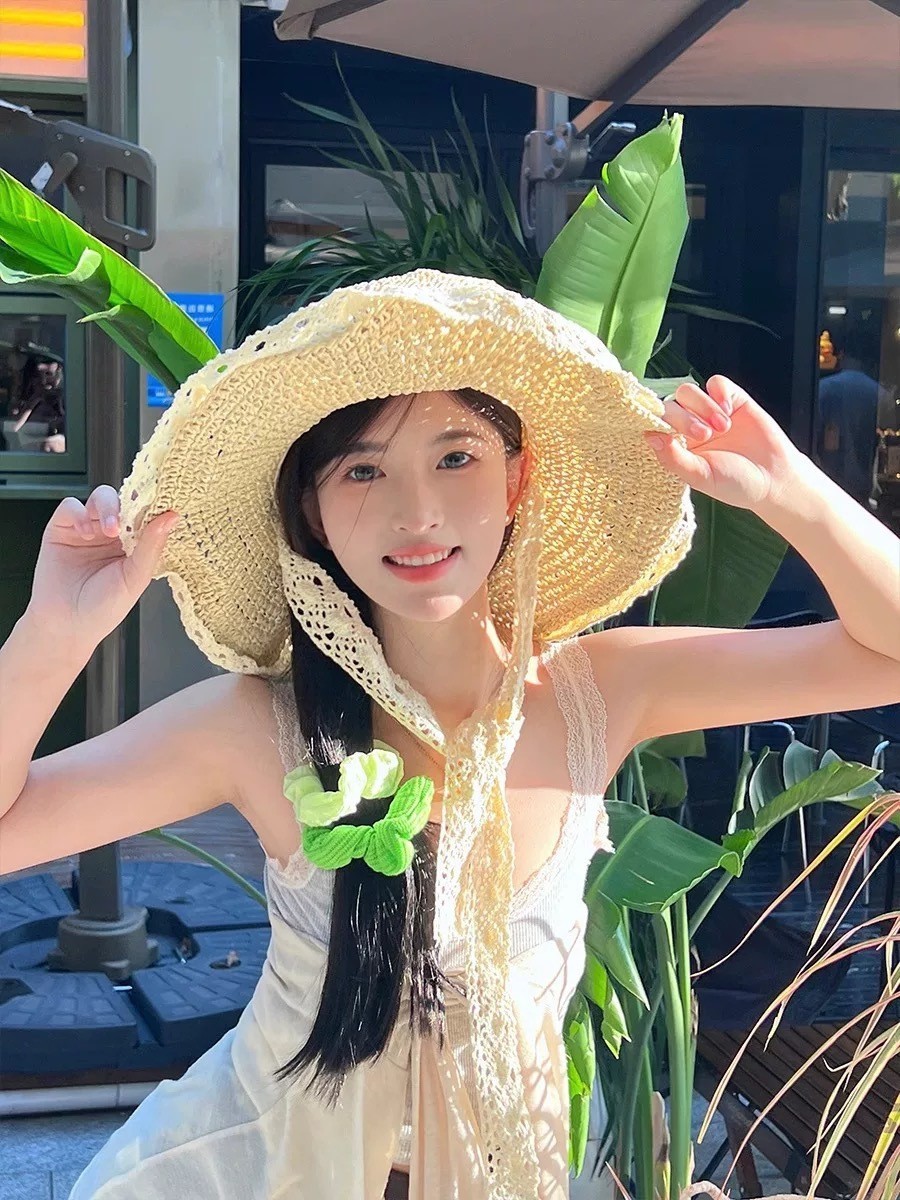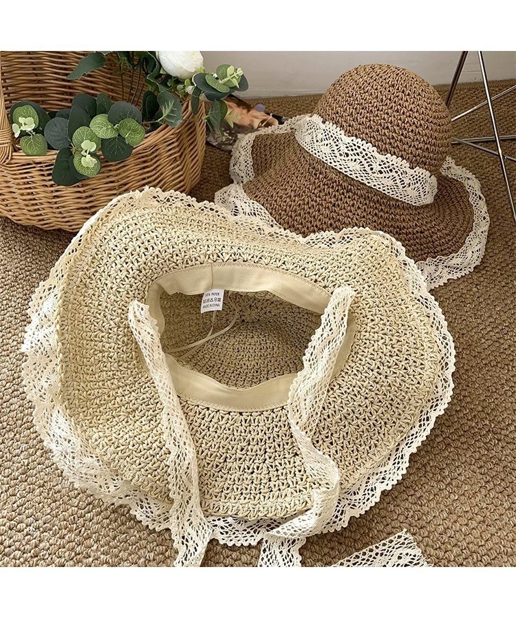 Women Straw Hat Big Brim Sun Hat UV Protection Cap Pastoral Style Spring Summer Lace Beach Travel Female Girls Fashion Foldable Ins