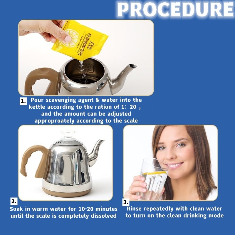 This product is suitable for water related products in home and office, such as electric kettle, water cup, humidifier, coffee machine, egg poacher, thermos bottle, etc. Ingredients for food grade citric acid, dirt and bacteria removal, excellent cleaning effect.Dosage and method: it is recommended to prepare scale remover and 1/20 water temperature of 60 degrees Celsius according to different sizes of products and scale formation, soak for 30 minutes, pour the scale remover solution after 30 minutes, and then wash it several times before normal use. If scale accumulation is serious, the above method can be repeated once.